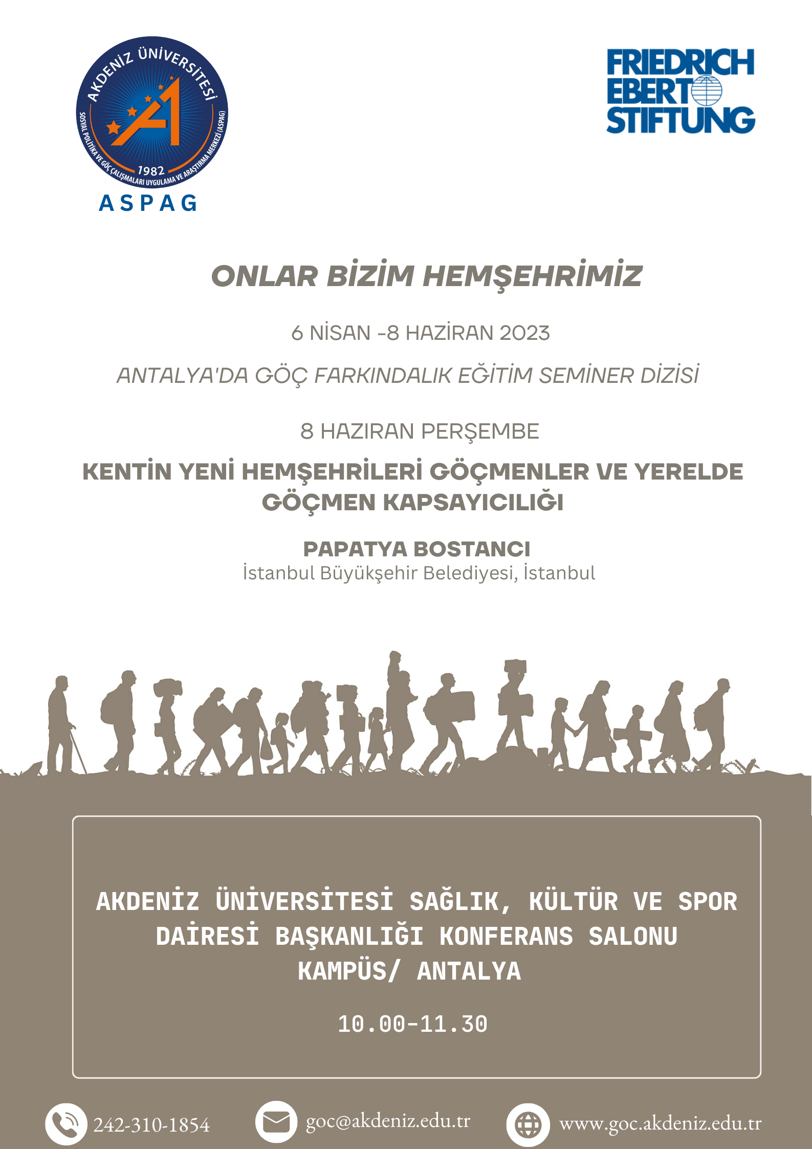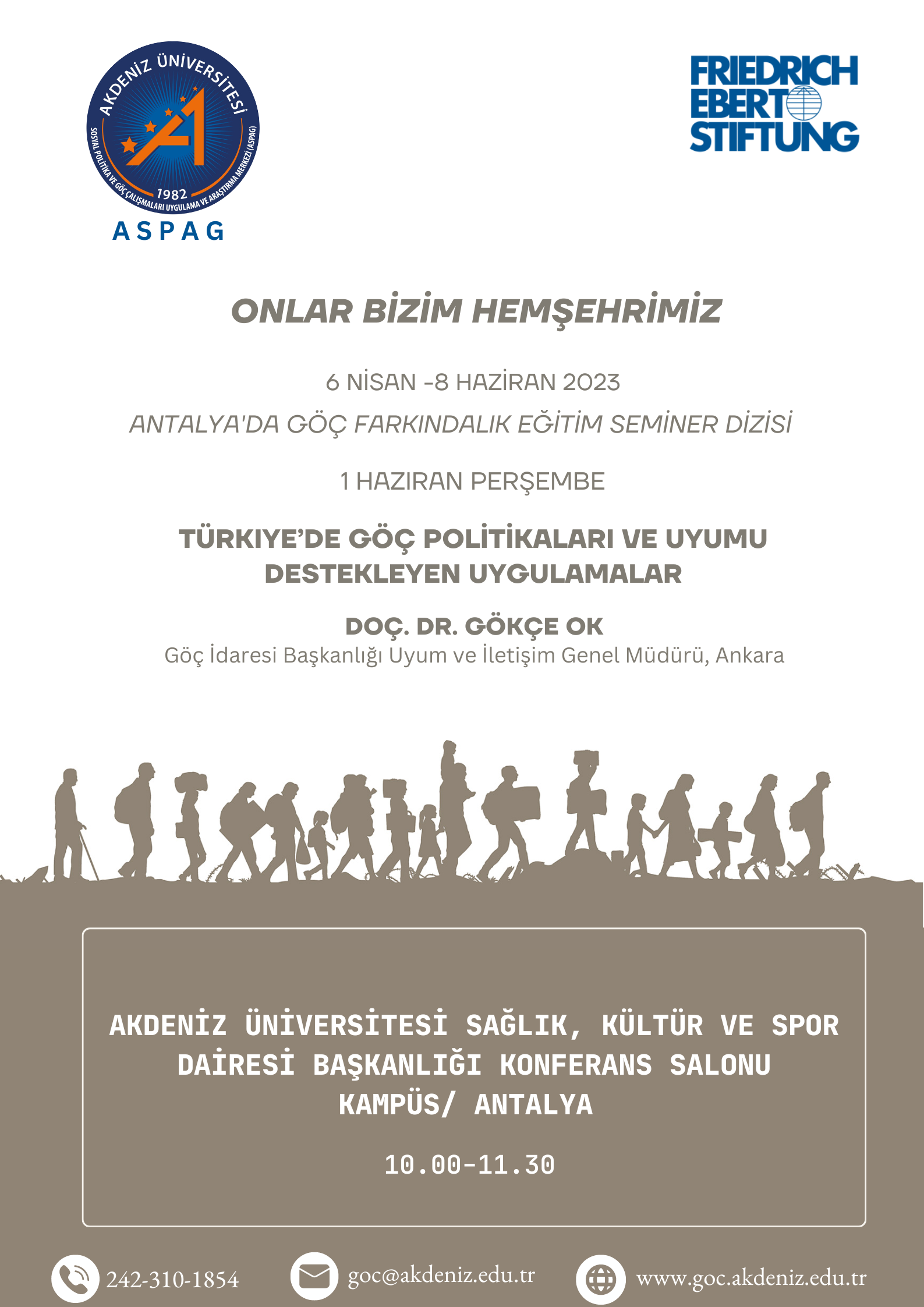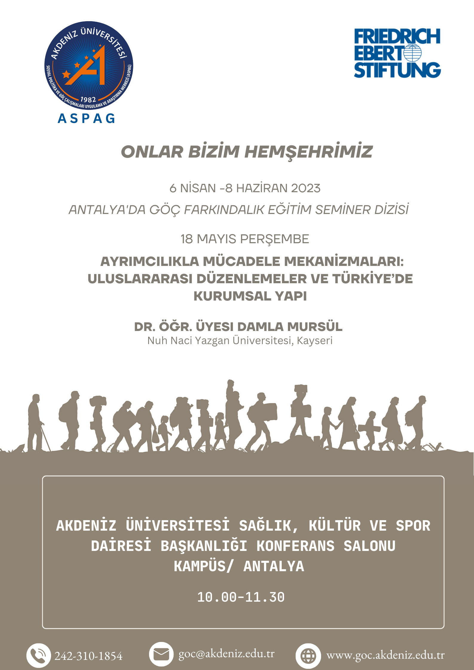 Akdeniz Üniversitesi Sosyal Politika ve Göç Çalışmaları Uygulama ve Araştırma Merkezi (ASPAG) Antalya Kurum içi Farkındalık Eğitimi düzenledi. 6 Nisan – 8 Haziran 2023 tarihleri arasında düzenlenen ve 9 hafta süren eğitim seminerlerine Antalya ve ilçelerinden farklı kamu kurum ve kuruluşları ile STK’lardan yoğun ilgi gözlendi.